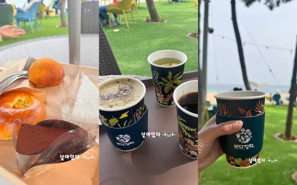 저희는 커피와 함께 브런치 메뉴를 즐겼는데, 신선하고 맛있는 빵과 함께 탁 트인 바다를 보며 먹는 느낌은 정말 특별했습니다. 카페 곳곳에 사람들로 북적였지만, 바다 뷰 덕분에 여유롭고 평화로운 느낌을 받을 수 있었습니다.