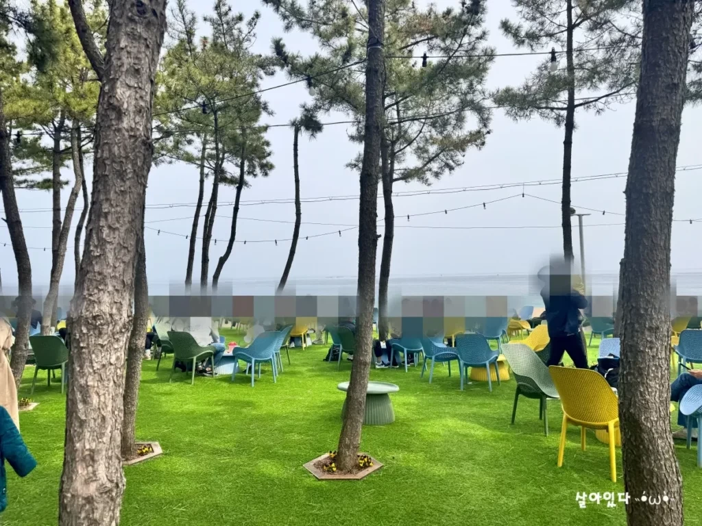 이날도 카페 전체가 사람들로 가득 차 있었는데, 특히 야외 테이블은 이미 자리가 없을 정도로 인기가 많았습니다. 저희는 해가 많이 내리쬐는 것을 피하기 위해 뒤편에 위치한 자리에 앉았는데, 이 자리에서도 여전히 바다와 해변이 훤히 보였습니다.
