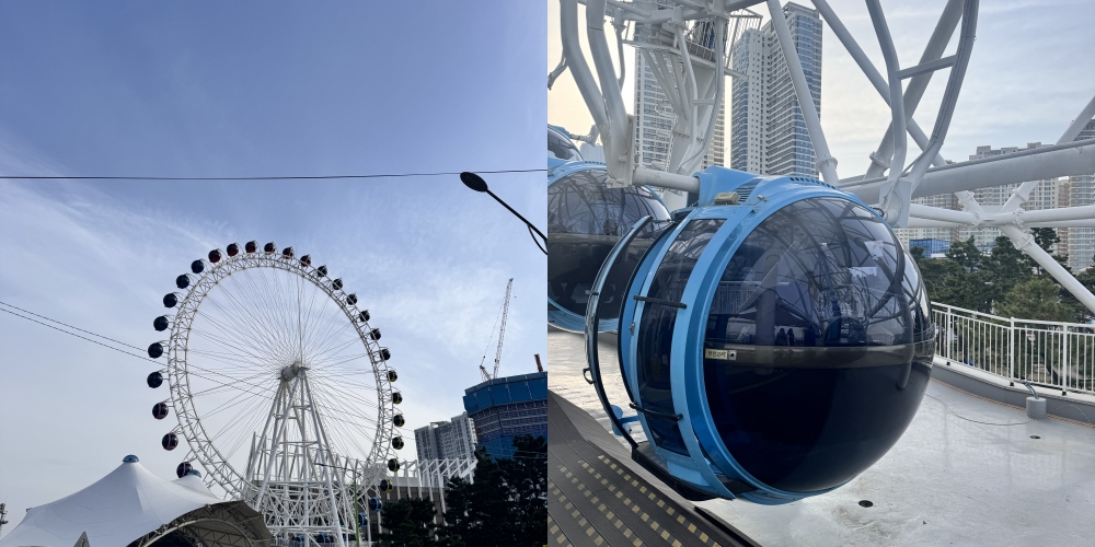관람차는 외부에서는 그리 넓지 않아 보였는데 내부에 들어가니 생각보다 넓었다. 생긴지 오래 되지 않아서 내부도 깨끗하고 좌석도 편안하였다. 통유리로 되어 있어서 외부가 한눈에 잘 보여서 뷰 관람을 하기가 좋았다. 날이 맑아서 바다 멀리 수평선 까지 한눈에 잘 보였다.
