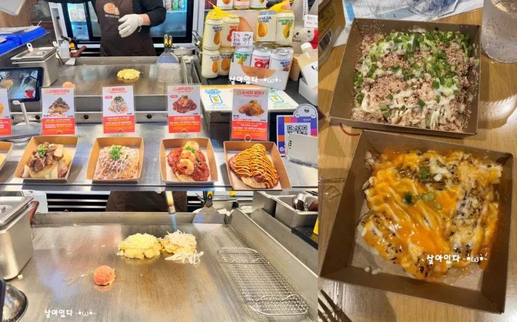 둘째 날에는 숙소에서 가볍게 먹을 간식거리를 사러 다시 방문했습니다. 명랑바게트와 팔공감자에서 간식을 샀습니다. 팔공감자는 주문을 하면 그 자리에서 불판에서 감자를 구워주는 방식으로, 저녁 식사 후 간단히 먹기 좋은 메뉴였습니다.