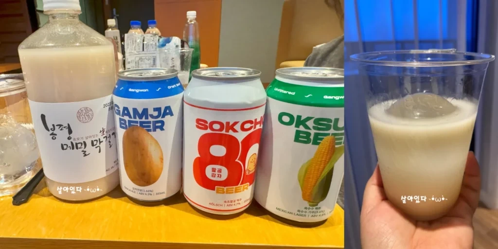 간식을 사는 김에 속초에서만 판매하는 속초맥주와 봉평메밀막걸리도 구입했습니다. 요즘 지역별로 특산품을 활용해 만든 지역 맥주가 인기를 끌고 있는데, 속초도 예외는 아니었습니다. 우리는 기본속초, 감자, 옥수수 맥주를 시도해보았습니다.