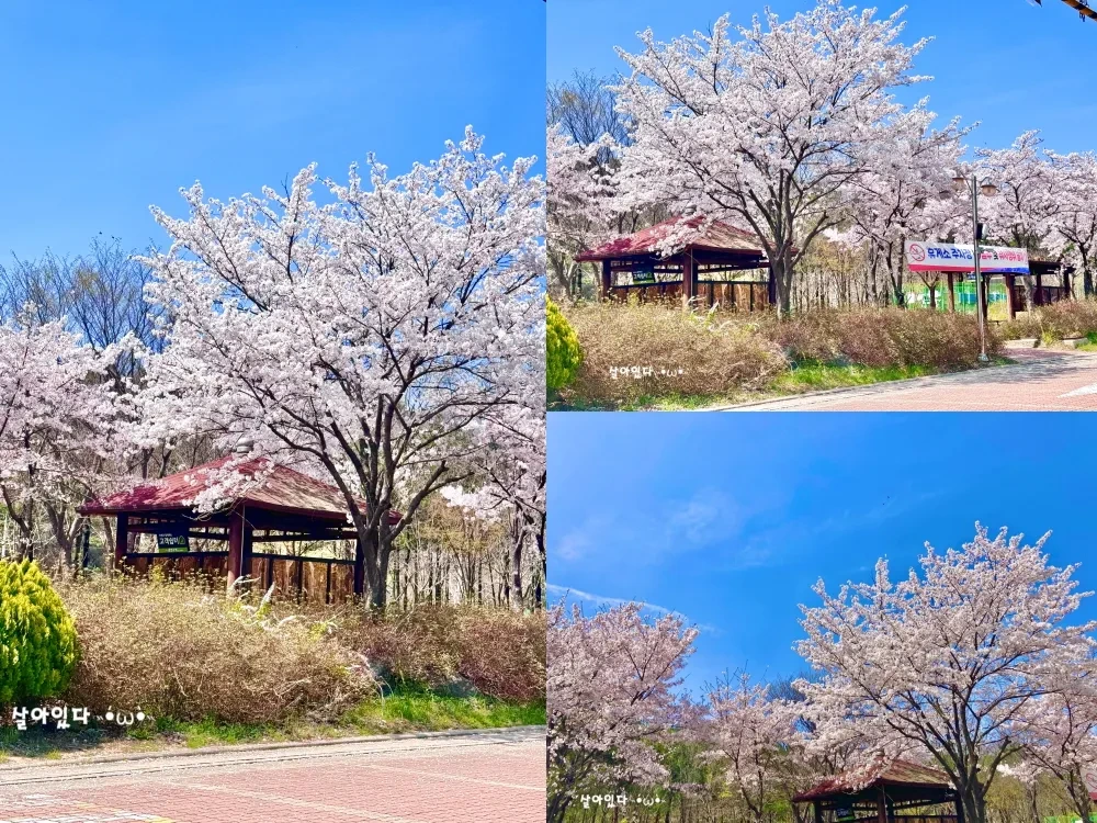 식사를 마치고 휴게소를 나서는 길에, 휴게소 외부에서 활짝 핀 벚꽃을 발견했습니다. 속초에서 기대했던 벚꽃을 보지 못해 아쉬웠는데, 이렇게 뜻밖의 장소에서 활짝 핀 벚꽃을 만나니 기분이 정말 좋더라고요. 휴게소 건물 주변에는 정자와 함께 커다란 벚꽃나무가 자리 잡고 있어 마치 작은 벚꽃 축제 현장에 온 것 같았습니다.
