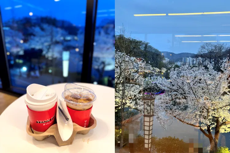 봄철에는 벚꽃이 만개한 연화지의 풍경을 카페 안에서 감상할 수 있어, 벚꽃 시즌에 방문하면 더욱 특별한 시간을 보낼 수 있습니다.