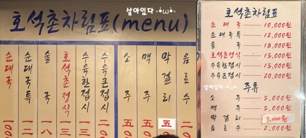 호석촌의 메뉴는 매우 심플합니다. 벽에 메뉴판이 걸려 있고, 테이블마다 메뉴 차림표가 놓여 있어요.