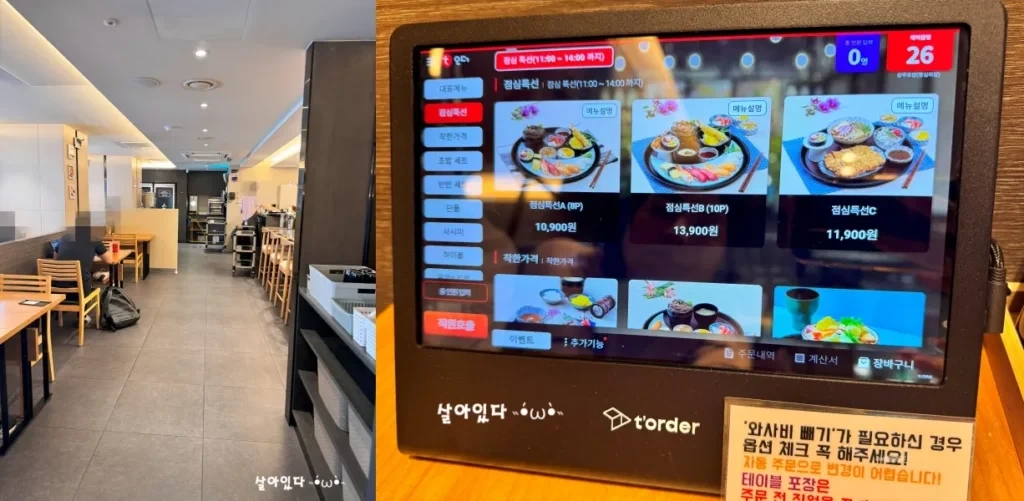 상무초밥의 매력 중 하나는 저렴하면서도 맛있는 초밥과 다양한 일본 요리를 경험할 수 있다는 점입니다. 테이블마다 있는 키오스크를 이용해 편리하게 주문할 수 있었고, 점심 특선도 주말에 이용 가능했습니다.