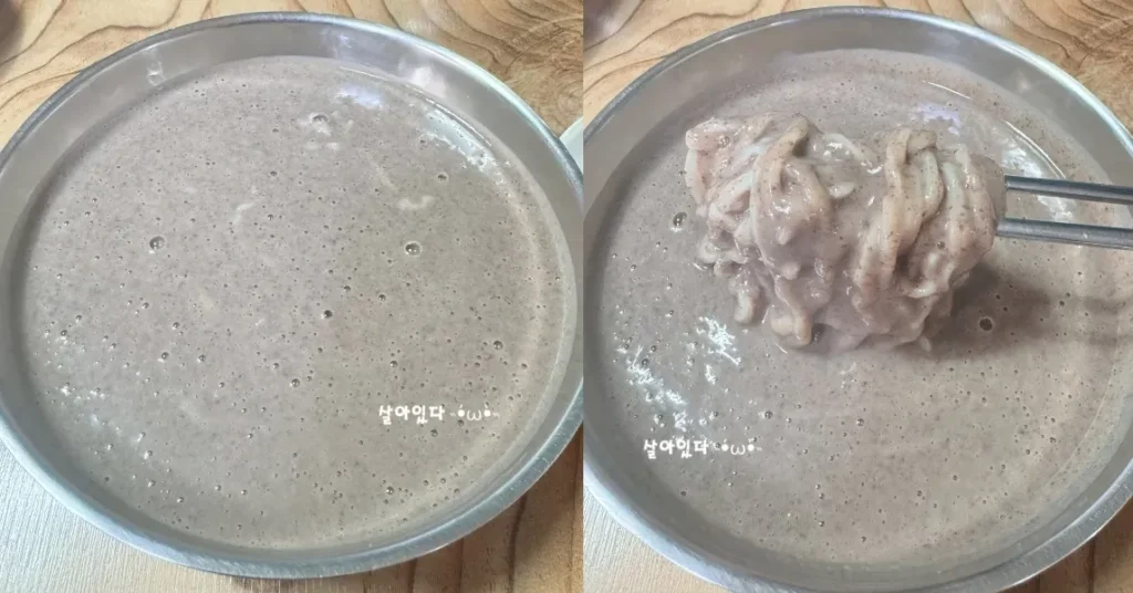 면은 두껍지 않고 쫄깃한 식감을 가지고 있으며, 검은콩의 고소함과 단맛이 어우러져 시원하고 부드러운 맛을 냅니다. 팥죽 같은 느낌도 나고, 별다른 양념 없이도 충분히 맛있는 콩국수라 어린이도 맛있게 먹을 수 있는 메뉴입니다.